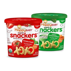 Happy Baby Organic Snackers là một món ăn nhẹ làm từ hạt ngũ cốc nướng phồng, có vị mặn thơm ngon dành cho các bé đang tập bò.