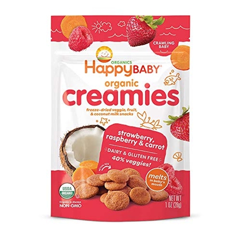 Bánh snack ăn dặm hữu cơ từ sữa dừa sấy khô và rau củ quả của Happy Baby Organic Creamies được làm từ kem sữa dừa không đường và thành phần chứa 40% rau củ quả sẽ giúp bé quen dần với việc tập ăn rau củ